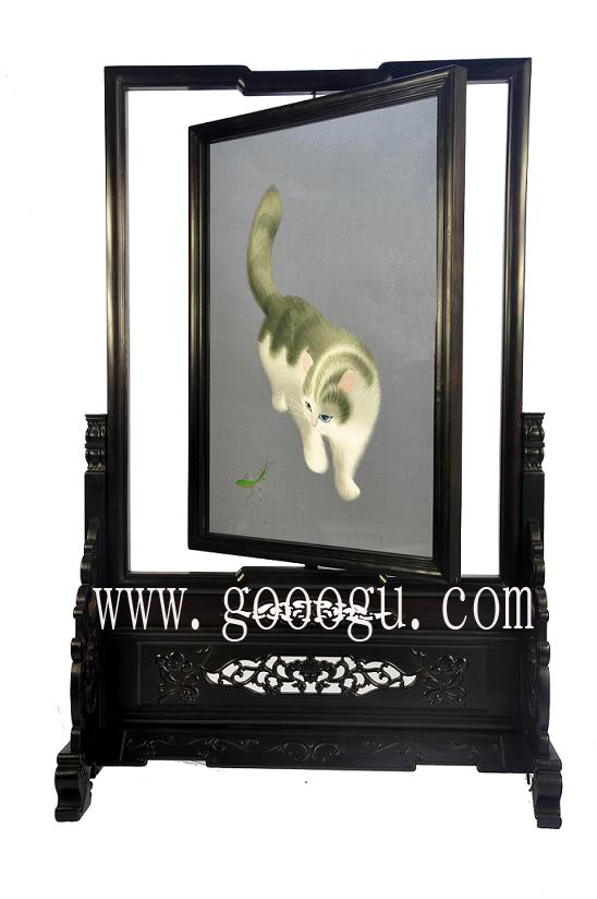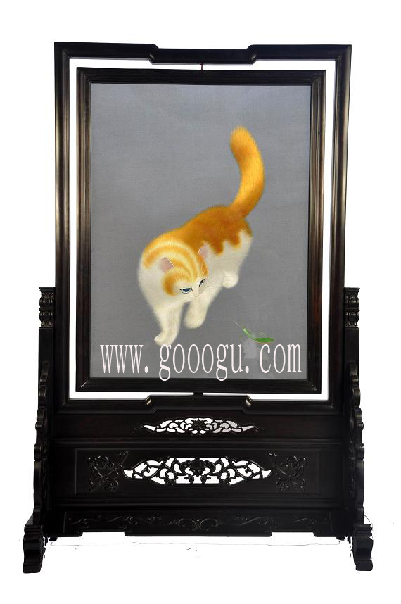 走進(jìn)嬌古蘇繡的展廳,我們驚嘆于陳列室里作品的浩繁與精致,先來看傳統(tǒng)題材的作品。花鳥繡是蘇繡傳統(tǒng)產(chǎn)品,它是明清時(shí)期閨閣繡的延續(xù)。蘇繡工藝品《小 貓》、《金魚》曾在國際上得獎(jiǎng),《小貓》的名氣在于貓眼用二十六種不同顏色的絲線繡成;《金魚》的輝煌則是魚尾最細(xì)處僅用一根線的四十八分之一。蘇州各大 旅游景點(diǎn)也屢見小貓金魚的姿態(tài),如何擺脫蘇繡工藝品的匠氣,使俗氣的工藝品成為震撼人心的藝術(shù)品,這是嬌古蘇繡多年來苦苦研究的問題。看,這幅現(xiàn)代 刺繡藝術(shù)品《貓》。同樣是貓,傳統(tǒng)的貓講究具體,形象,栩栩如生。而我們面前的兩幅《貓》:一幅白底白貓,一幅黑底黑貓。貓?jiān)谀睦铮控堅(jiān)诎咨铮堅(jiān)诤谏?里,貓?jiān)谀銦o盡的想像里。想像之上,具象已與抽象結(jié)合起來,達(dá)到了藝術(shù)升華。同是蘇繡作品,構(gòu)思變了,功底卻不改,《貓》作品之外給人的聯(lián)想可謂余音裊裊。 |