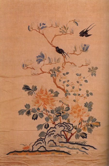 蘇繡有著悠久的歷史和文化,是華夏文明中一顆璀璨的明珠。蘇繡發(fā)源于古老的蘇州吳縣一帶,已有上千年的時間,蘇繡在明清時期發(fā)展迅速,北京故宮博物院藏清代乾隆時期“白綾繡五彩玉堂富貴圖”。此圖以白色綾為底襯,在白色綾底襯上,以藍、綠、紅、白、黃、黑為主色調(diào),19種彩色絨線及捻金線為繡線,運用2-3配色發(fā),采取正戧針、齊針、刻鱗針、松針、雞毛針、散套針、平針等針?biāo)嚰记桑C制寓意“玉堂富貴”、“靈仙祝壽”之意的牡丹、玉蘭、海棠、太湖石、靈芝、春燕紋飾。此圖由于采用正戧針繡牡丹的葉、花及玉蘭、海棠花、用雞毛針繡海棠葉,用齊針繡牡丹、玉蘭、海棠的枝干,使花紋姿態(tài)優(yōu)美,形象生動,栩栩如生,生機盎然,富有極強的立體感和裝飾效果