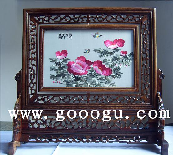 (一) 普通檔蘇州雙面繡:普通檔蘇州雙面繡以其圖案做工一般,框架材質(zhì)普通(多以菠蘿格為木質(zhì)),繡片做工多以一根粗線或一絨構(gòu)成。尺寸方面以小規(guī)格為主,常規(guī)尺寸為20圓厘米直徑,三十圓厘米直徑,14*20CM(畫心尺寸) 16*25CM(畫心尺寸),30CM圓直徑等。名稱民間稱法不一,筆者就此做簡(jiǎn)單的介紹,如單龍頭架,雙龍頭架,同心圓等,。包裝方面目前以簡(jiǎn)單禮盒裝為主(筆者認(rèn)為做為禮品還欠缺,有待改進(jìn))。目前以擺在桌面臺(tái)屏雙面繡為主。蘇繡圖案多以牡丹,花草,小動(dòng)物為主,目前整體圖案搭配創(chuàng)新方面不是太強(qiáng)。在國內(nèi)蘇繡市場(chǎng)普通檔蘇州雙面繡目前所占的比重比較大,普遍價(jià)格不高,出廠價(jià)一般在一百至兩百元左右。是目前很多企業(yè)采購的重點(diǎn)檔次選擇之一。可做為企業(yè)商務(wù)禮品,會(huì)議禮品,紀(jì)念禮品。加上燙金工藝,是企業(yè)宣傳廣告的好載體之一。