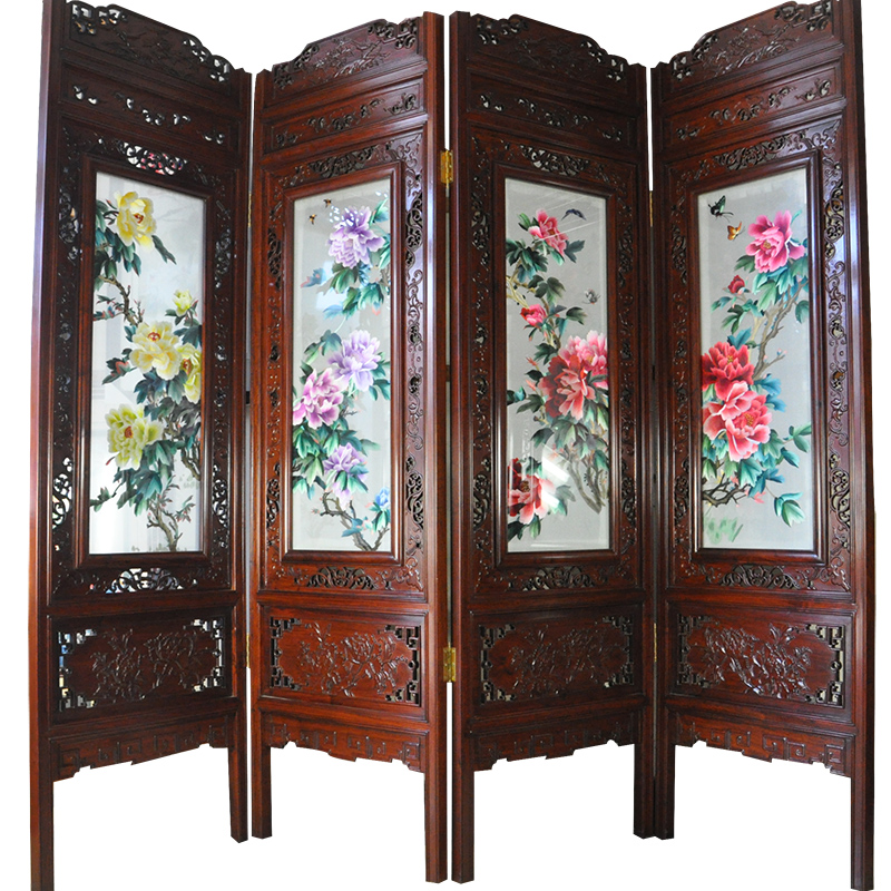 蘇繡屏風 手工刺繡 大型四扇折疊屏風 牡丹花 紅木工藝品