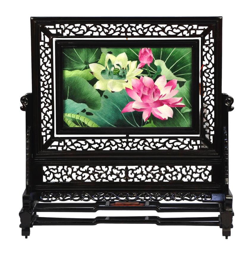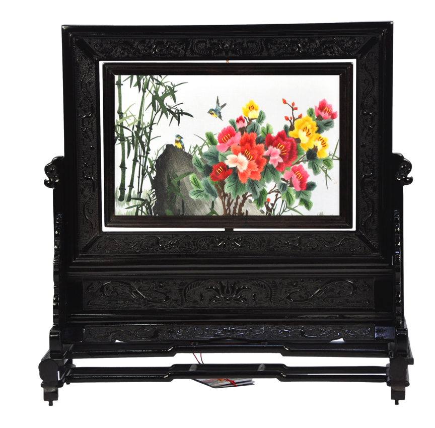 產(chǎn)品名稱:紫檀蘇州雙面繡 (作品代碼:SZ-7889) 產(chǎn)品規(guī)格:46X41CM(外框尺寸) 25X16CM(繡品尺寸) 產(chǎn)品工藝:蘇州繡娘手工刺繡。繡品圖案部分可360度旋轉(zhuǎn) 產(chǎn)品材質(zhì):真絲面料+桑蠶絲線+玻璃+紫光檀木架 產(chǎn)品包裝:錦盒禮品裝 嬌古出廠價:2800元/件 市場零售參考價:6000元左右 最小起訂量:1件----廠家直銷,可當天發(fā)貨(可混配圖案) 產(chǎn)品描述:紫光檀蘇州雙面繡為蘇州繡娘手工刺繡而成,木框為目前中國蘇州雙面繡材質(zhì)紫光檀,整體框架花紋雕刻細膩。圖案有花卉(牡丹,梅花,荷花,蘭花等),花鳥,動物(熊貓,老虎,魚等),山水,風(fēng)景,名家字畫等。圖案多達一百多種,有古色古香的,有現(xiàn)代氣息的,高貴典雅,是贈送客人的特色禮品之一。 系列推薦