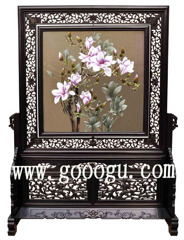玉蘭花細節(jié)照(局部圖) 產(chǎn)品名稱:40X40CM紫檀蘇繡雙面繡 (作品代碼:SY-488) 產(chǎn)品規(guī)格:刺繡圖案尺寸 40X40CM 外框整體尺寸最寬處65CM,高85CM 產(chǎn)品工藝:蘇州繡娘手工刺繡。繡品圖案部分可360度旋轉(zhuǎn) 產(chǎn)品材質(zhì):真絲面料+桑蠶絲線+玻璃+紫檀木架 產(chǎn)品包裝:錦盒禮品裝 嬌古出廠價:收藏級別,限量發(fā)行,嬌古蘇繡參考價,22000元 最小起訂量:1件----廠家直銷,可當天發(fā)貨(可混配圖案) 產(chǎn)品描述:【40X40CM檀木雙面繡】蘇州雙面繡為蘇州刺繡工藝師純手工刺繡而成,木框材質(zhì)為紫檀,整體框架花紋雕刻細膩。圖案有花卉(牡丹,梅花,荷花,蘭花等),花鳥,動物(熊貓,老虎,魚等),山水,風(fēng)景,名家字畫等。圖案多達一百多種,有古色古香的,有現(xiàn)代氣息的,高貴典雅,是贈送客人的特色禮品之一。此款選取嬌古蘇繡資深高級工藝師歷時半年精心刺繡而成,每款題材的繡者均是專攻山水、牡丹或相關(guān)題材達數(shù)十載之久的專業(yè)技師。全國每年發(fā)行一件。歡迎收藏!