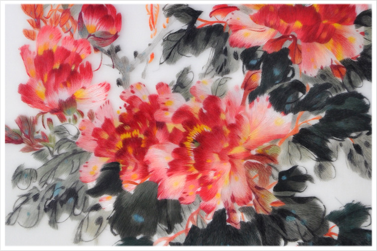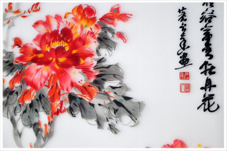 【品 牌】:嬌古 (作品代碼 D-1025) 【品 名】:國花牡丹裝飾畫(手工蘇繡) 【品 質(zhì)】:2-4絲刺繡 (蘇繡小知識(shí):1根蘇繡絲線可分為16絲,中檔刺繡皆為10絲所繡,中高檔刺繡皆為6-8絲,高檔刺繡皆為4-6絲,精品刺繡皆為1-4絲) 【尺 寸】:畫心尺寸55*100cm 整體尺寸75*135cm 【產(chǎn)品工藝】:手工刺繡 【絲線材質(zhì)】:蠶絲線 【用 途】:居家裝飾或送政府禮品、外賓禮品、生日禮物、賀壽禮品、領(lǐng)導(dǎo)升遷、出國禮品等等。 【出廠價(jià)格】:16000元 【細(xì)節(jié)圖】