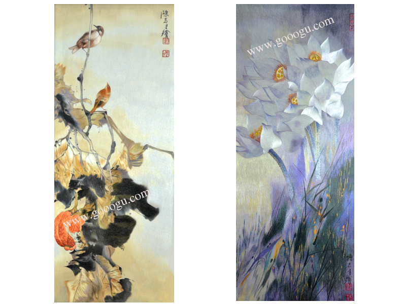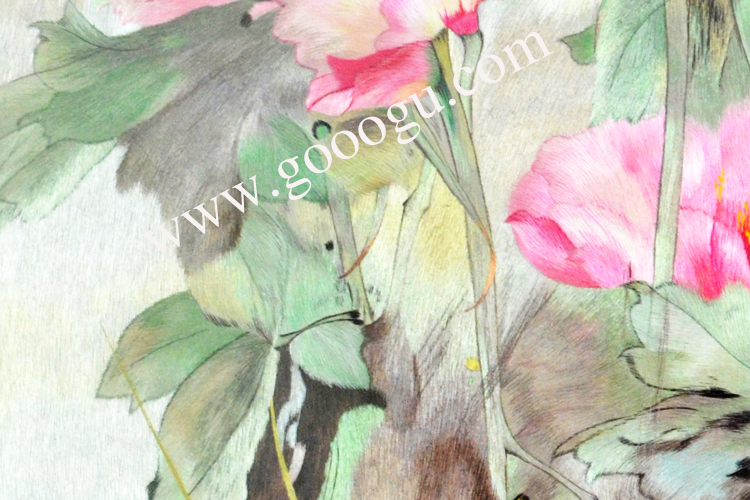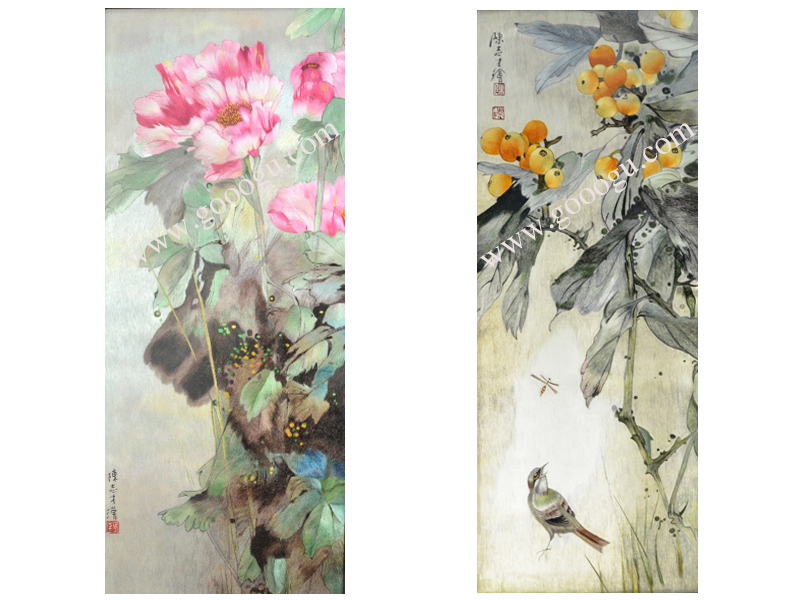 【產(chǎn)品名稱】:花鳥折疊屏風---陳志才花鳥(雙面繡) (作品代碼:ZP-1002) 【產(chǎn)品規(guī)格】:圖案尺寸寬40CM每扇,高100CM每扇 外框整體尺寸寬65cm每扇,高205cm每扇 【產(chǎn)品工藝】:手工刺繡 【產(chǎn)品材質(zhì)】:真絲面料+純天然雞翅木框+桑蠶絲線+玻璃 【產(chǎn)品包裝】:木箱包裝,用海綿包扎,確保運輸安全 【出廠價】:54800元 【產(chǎn)品運輸】:我司負責發(fā)往客戶指定地點,蘇州附近城市可送貨上門! 【產(chǎn)品說明】:此款純天然雙面繡折疊屏風,采用進口的雞翅木為框架材料,做工精細,整幅作品是由蘇州工藝師耗時數(shù)月手工刺繡而成,刺繡圖案繡工精細,顏色搭配均勻,整體給人舒適,愜意之感,木雕細膩精美,是蘇繡屏風中的經(jīng)典作品。是貴賓接待室或大廳的重要裝飾品之一!歡迎親臨嬌古蘇繡展示廳觀看實物! 【作品欣賞】 .jpg) 陳志才花鳥特寫 .jpg)