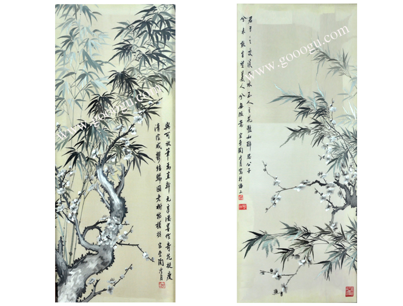 【產(chǎn)品名稱】:紅木蘇繡屏風(fēng)---梅竹(雙面繡) (作品代碼:ZP-1004) 【產(chǎn)品規(guī)格】:圖案尺寸寬35CM每扇,高90CM每扇 外框整體尺寸寬60cm每扇,高210cm每扇 【產(chǎn)品工藝】:手工刺繡 【產(chǎn)品材質(zhì)】:真絲面料+紅木框+桑蠶絲線+玻璃 【產(chǎn)品包裝】:木箱包裝,用海綿包扎,確保運(yùn)輸安全 【出廠價(jià)】:56800元 【產(chǎn)品運(yùn)輸】:我司負(fù)責(zé)發(fā)往客戶指定地點(diǎn),蘇州附近城市可送貨上門(mén)! 【產(chǎn)品說(shuō)明】:此款紅木雙面繡折疊屏風(fēng),是由蘇州工藝師耗時(shí)數(shù)個(gè)月精心手工刺繡而成,刺繡圖案為中國(guó)傳統(tǒng)的梅花和竹子,繡工精細(xì),顏色搭配均勻,整體給人舒適,愜意之感,紅木框架做工精細(xì)手工打磨,是蘇繡屏風(fēng)中的經(jīng)典作品。是企事業(yè)大堂或大廳的重要裝飾品之一!歡迎親臨嬌古蘇繡展示廳觀看實(shí)物! 【作品欣賞】 .jpg)