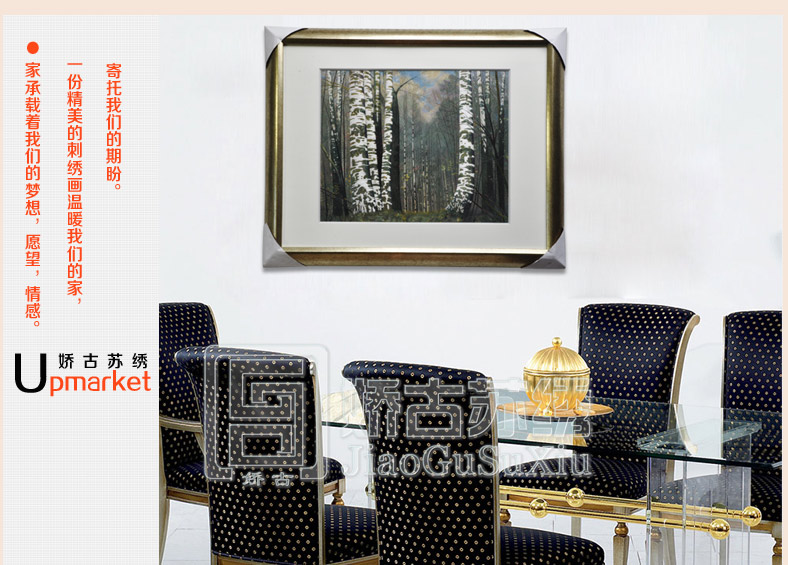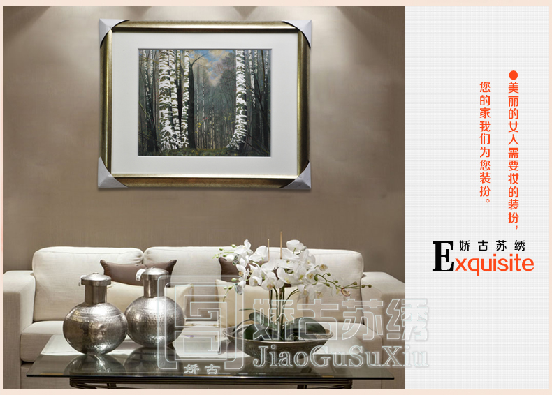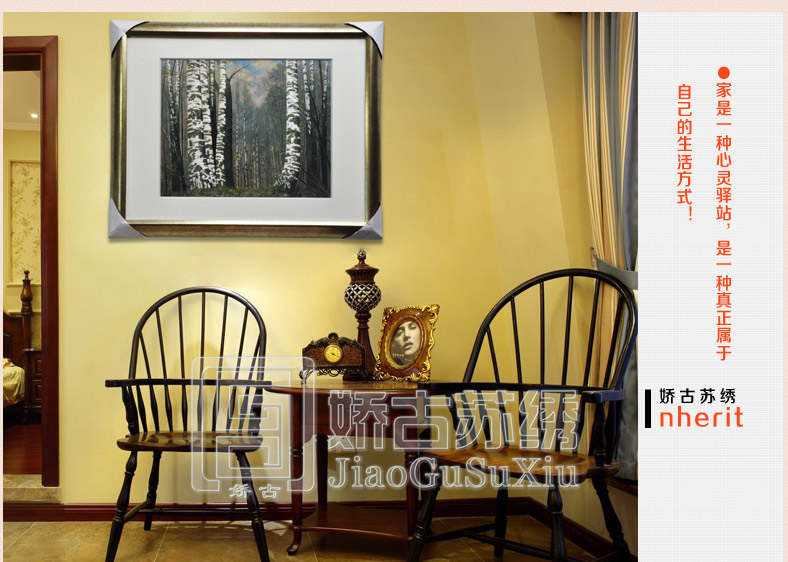 【品 牌】:嬌古 (作品代碼 D-1066)【品 名】:白樺林裝飾畫【尺 寸】:畫心尺寸50*60cm 整體尺寸80*97cm【產(chǎn)品工藝】:手工刺繡【絲線材質(zhì)】:蠶絲線 【用 途】:政府禮品、外賓禮品、生日禮物、領(lǐng)導(dǎo)升遷、出國(guó)禮品等等。【出廠價(jià)格】:14800元