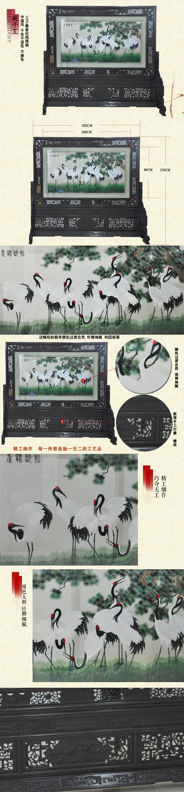 【產(chǎn)品名稱】:松鶴延年(雙面繡) (作品代碼:p-1526) 【產(chǎn)品規(guī)格】:圖案尺寸寬度160cm,高度90cm 外框整體尺寸寬203cm,高178cm 【產(chǎn)品工藝】:手工刺繡 【產(chǎn)品材質(zhì)】:真絲面料+雞翅木+桑蠶絲線+玻璃 【產(chǎn)品包裝】:木箱包裝,用海綿包扎,確保運(yùn)輸安全 【出廠價(jià)】:24800元 【產(chǎn)品運(yùn)輸】:我司負(fù)責(zé)發(fā)往客戶指定地點(diǎn),蘇州附近城市可送貨上門! 【產(chǎn)品說明】:松鶴延年雙面繡屏風(fēng),是由蘇州工藝師耗時(shí)數(shù)個(gè)月精心手工刺繡而成,刺繡圖案以代表健康長(zhǎng)壽的松鶴為題材繡工精細(xì),簡(jiǎn)約 大方,顏色搭配均勻過渡自然,屏風(fēng)的框架選用進(jìn)口的雞翅木為料,是蘇繡屏風(fēng)中的經(jīng)典作品。是居家和辦公的重要裝飾品之一!歡迎親臨嬌古蘇繡展示廳觀看實(shí)物! .jpg)